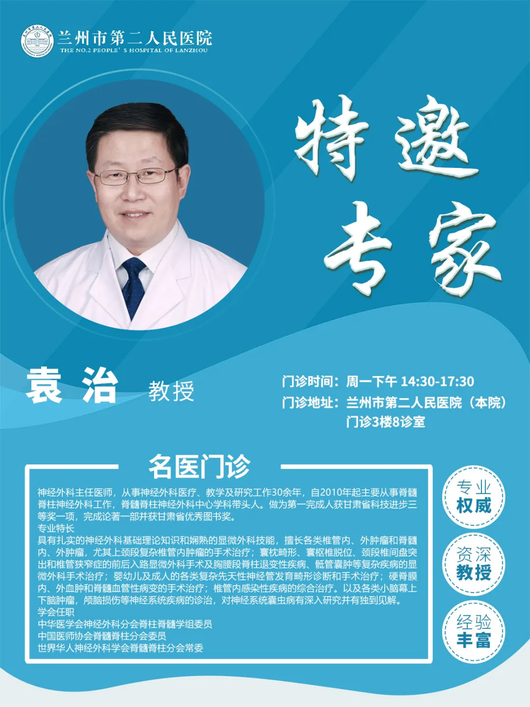 职 务:特邀专家 职 称:教授 擅 长:具有扎实的神经外科基础理论知识和娴熟的显微外科技能,擅长各类椎管内、外肿瘤和脊髓内、外肿瘤,尤其上颈段复杂椎管内肿瘤的手术治疗;寰枕畸形、寰枢椎脱位、颈段椎间盘突出和椎管狭窄症的前后入路显微外科手术及胸腰段脊柱退变性疾病、骶管囊肿等复杂疾病的显微外科手术治疗;婴幼儿及成人的各类复杂先天性神经管发育畸形诊断和手术治疗;硬脊膜内、外血肿和脊髓血管性病变的手术治疗...